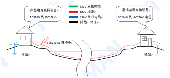 在岸站处,将380V动力电转变成DC10kV 30kW。经过约百海里传输到远端,在远端处将输入电压逆变为AC220。
